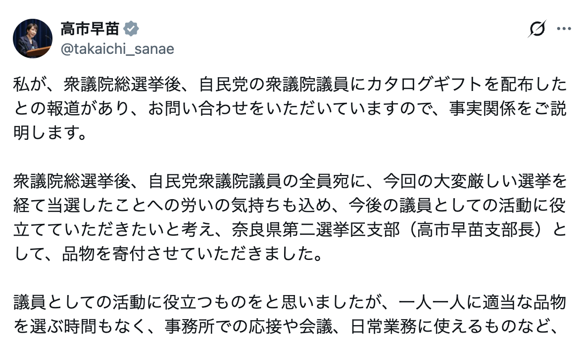 私が、衆議院総選挙後、自民党の衆議院議員にカタログギフトを配布したとの報道があり、お問い合わせをいただいていますので、事実関係をご説明します。…