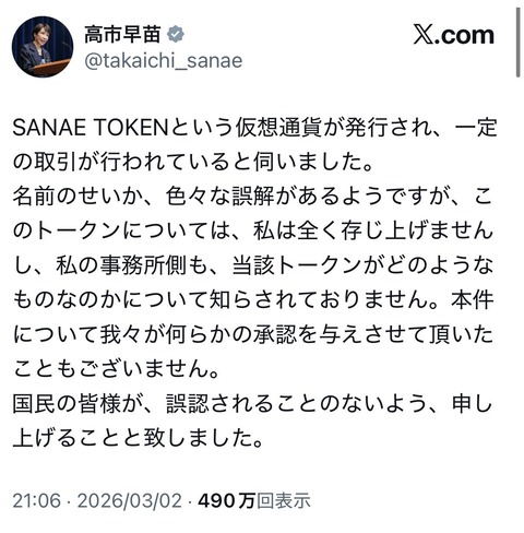 【悲報】溝口さん率いるノーボーダー、高市早苗トークン(SANAE TOKEN)を発行してしまい、国を巻き込む大騒動に : IT速報