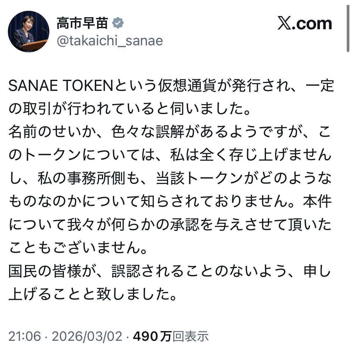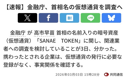 【SANAE TOKEN】金融庁、首相名仮想通貨を調査へ 企業登録確認できず