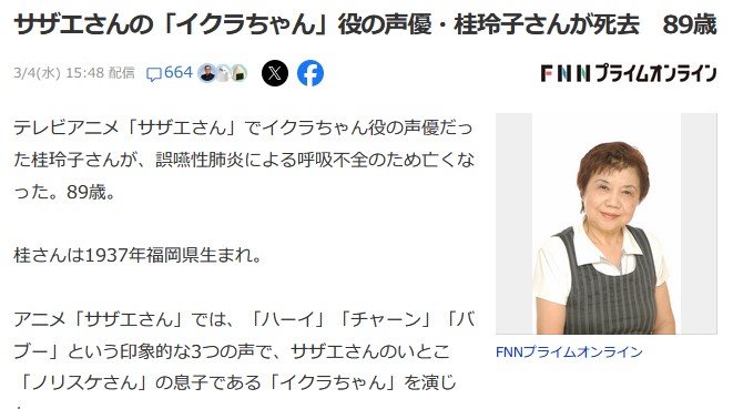 サザエさんの「イクラちゃん」役の声優・桂玲子さんが死去 89歳