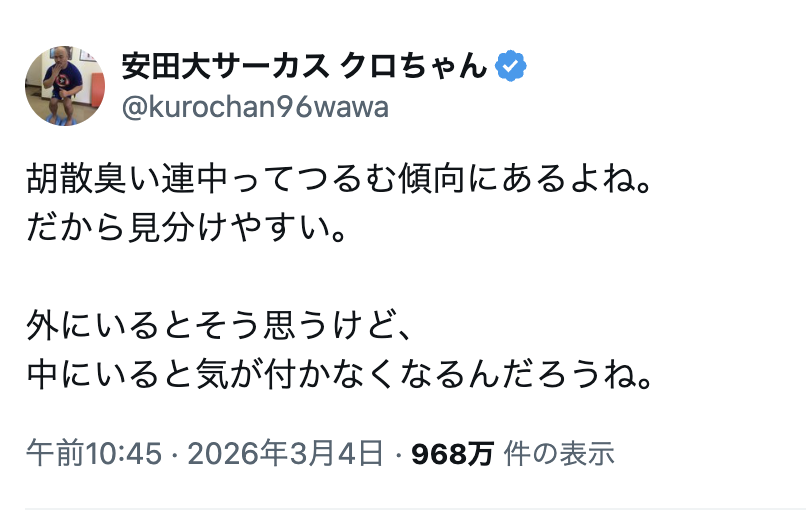 中にいると気が付かなくなるんだろうね。— 安田大サーカス クロちゃん (@kurochan96wawa) March 4, 2026