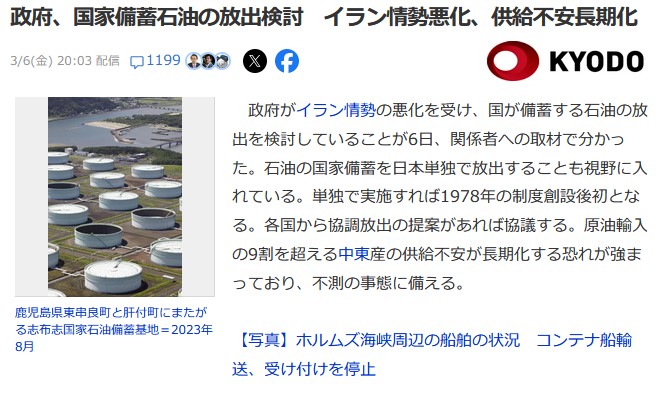 政府、国家備蓄石油の放出検討 イラン情勢悪化、供給不安長期化