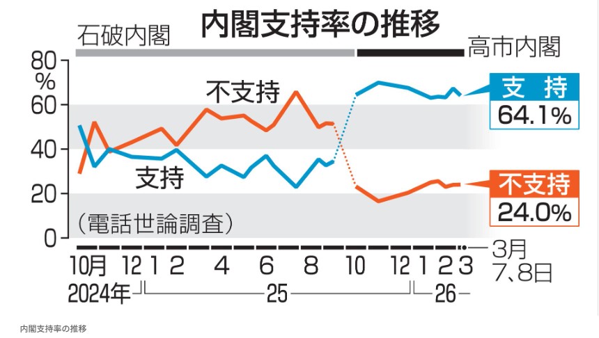 高市内閣支持率64%(3.2ポイント減少)、不支持24% ー 共同通信世論調査