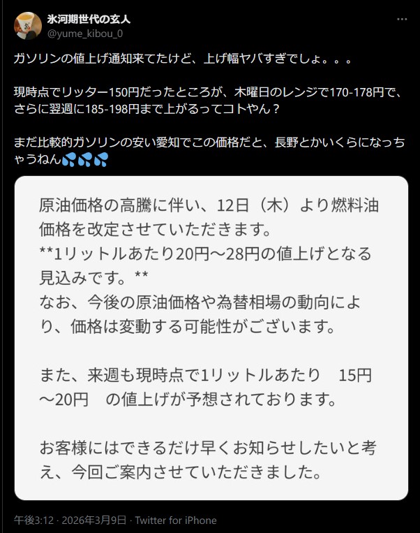 【悲報】ガソリン1リットル200円超えの見通し 来週にも今より50円近く上昇 中東情勢悪化で原油価格高騰