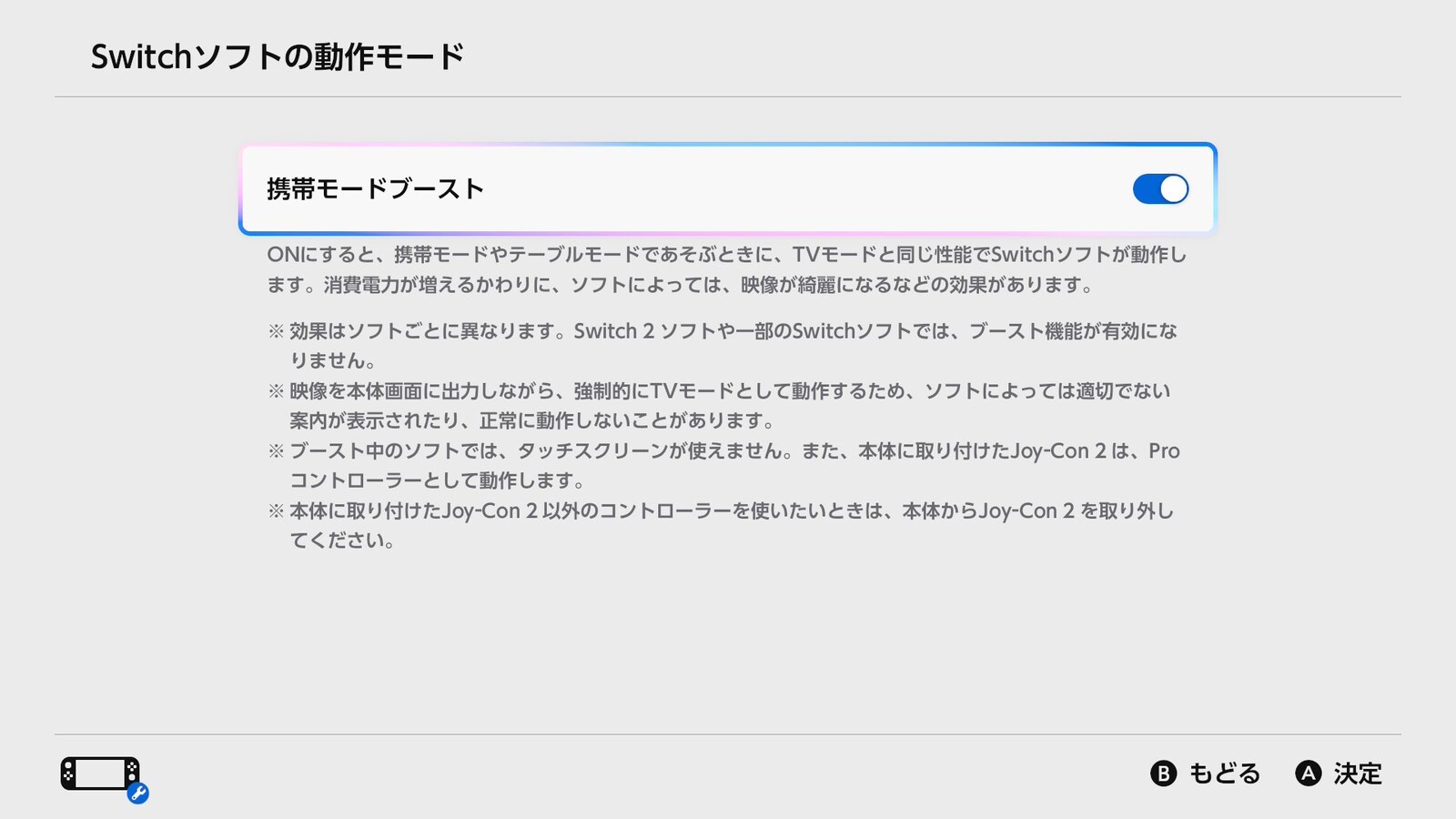 「本体」→「Switchソフトの動作モード」で、携帯モードブーストの設定をできるようにしました。