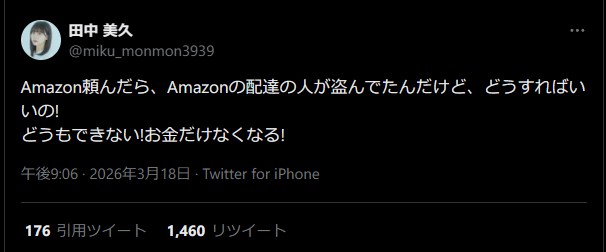元HKT48・田中美久「Amazon配達員に荷物盗まれた。どうもできない!お金だけなくなる!」