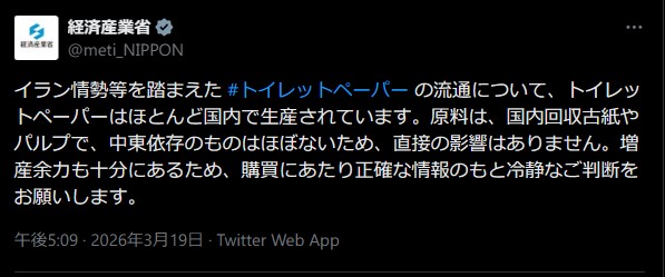 SNS「石油止まってトイレットペーパー品薄になる」 経産省「トイレットペーパーの原料は中東に依存していないから大丈夫。日本家庭紙工業会が増産余力もあると言ってる」