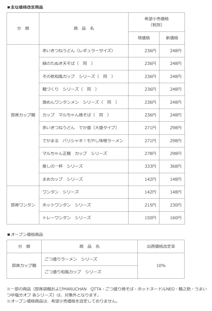 ※即席袋麺および一部の即席カップ麺につきまして価格の改定はございません。