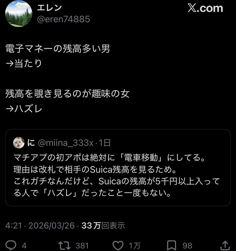 これガチなんだけど、Suicaの残高が5千円以上入ってる人で「ハズレ」だったこと一度もない。— に (@miina_333x) March 25, 2026