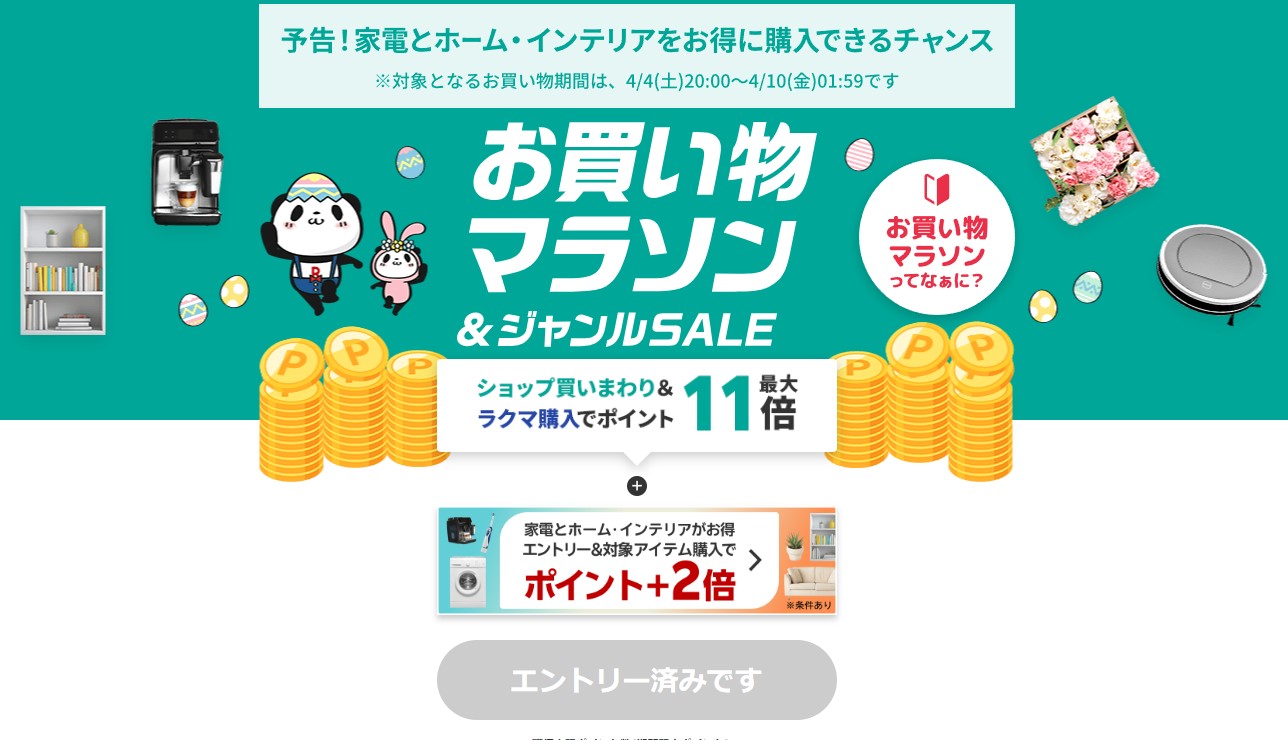 楽天市場「お買い物マラソン」と「家電・ホーム・インテリアポイント3倍」を4日20時から開催