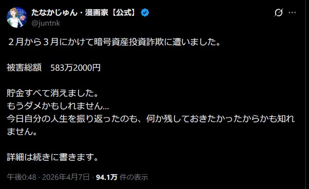 漫画家のたなかじゅん氏、暗号資産投資詐欺に引っかかる「貯金すべて消えました」「たなか家は詰んでしまいました」