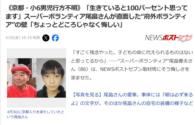 《京都の小6男児行方不明》スーパーボランティア尾畠は断られていた「京都に籍のない人は厳しいと」「生きていると100パーセント思ってます」