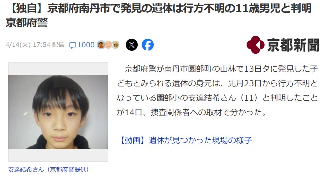 京都・南丹市で発見された遺体は行方不明だった小6男児・安達結希さんと判明
