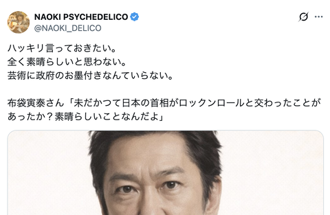 NAOKIは、布袋が11日にXで投稿し、その後削除したとされる投稿を紹介したまとめサイトの記事を引用。記事では布袋のアカウントで「未だかつて日本の首相がロックンロールと交わったことがあったか?素晴らしいことなんだよ」と記したと伝えている。11日に、来日している英国の伝説的ハードロックバンド、ディープ・パープルが東京・日本武道館公演を前に、首相官邸を表敬訪問し、大ファンで知られる高市早苗首相と面会したことから、その内容を受けての投稿とみられていた…