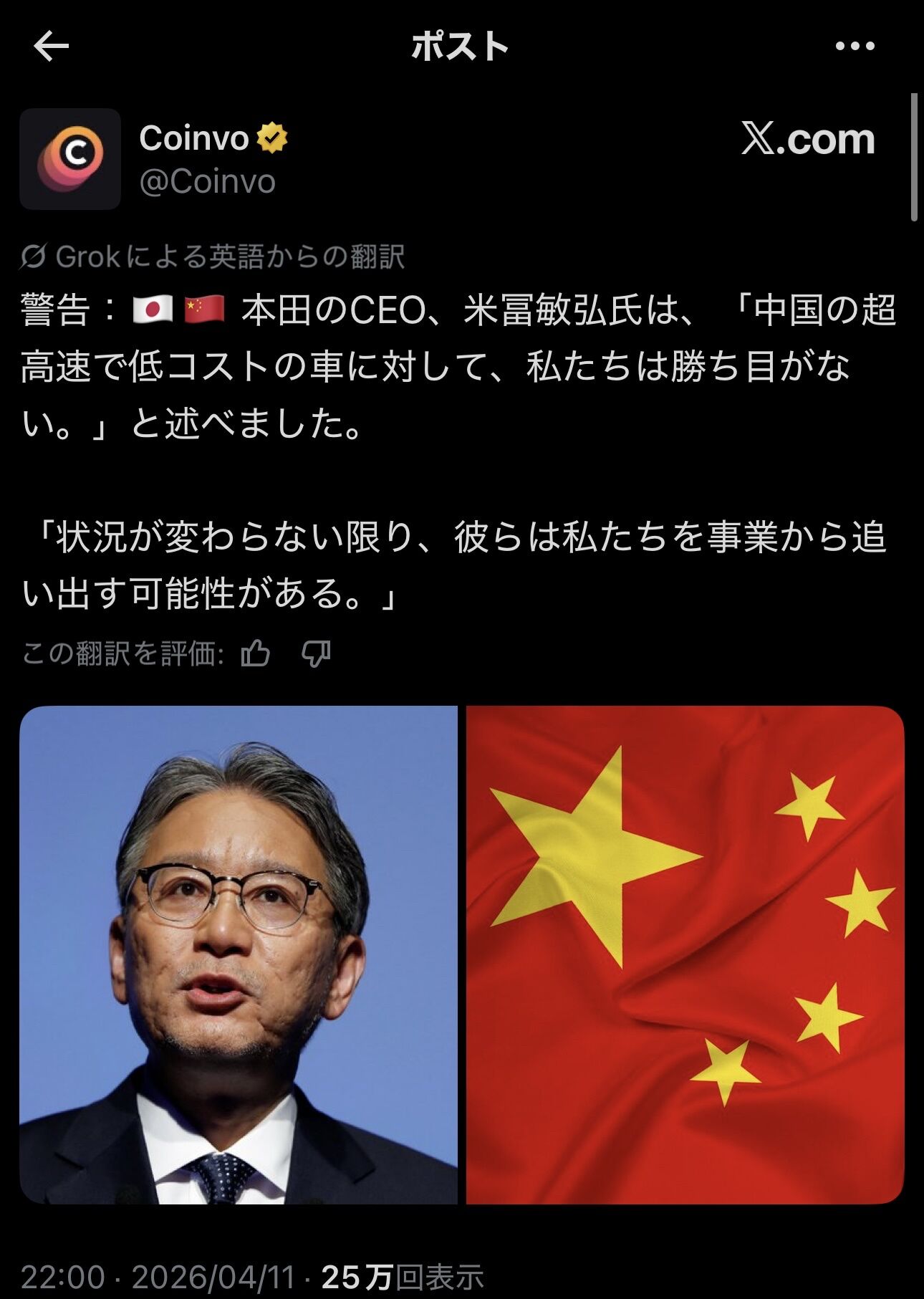 【悲報】日本の自動車産業、完全終了へ。ホンダが中国に白旗「超高速で低コストな中国車に私たちは勝ち目ない」