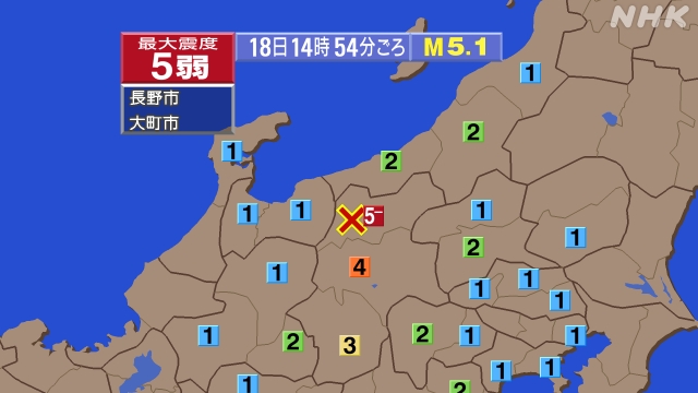 【悲報】長野で震度5強の地震と5弱の地震観測