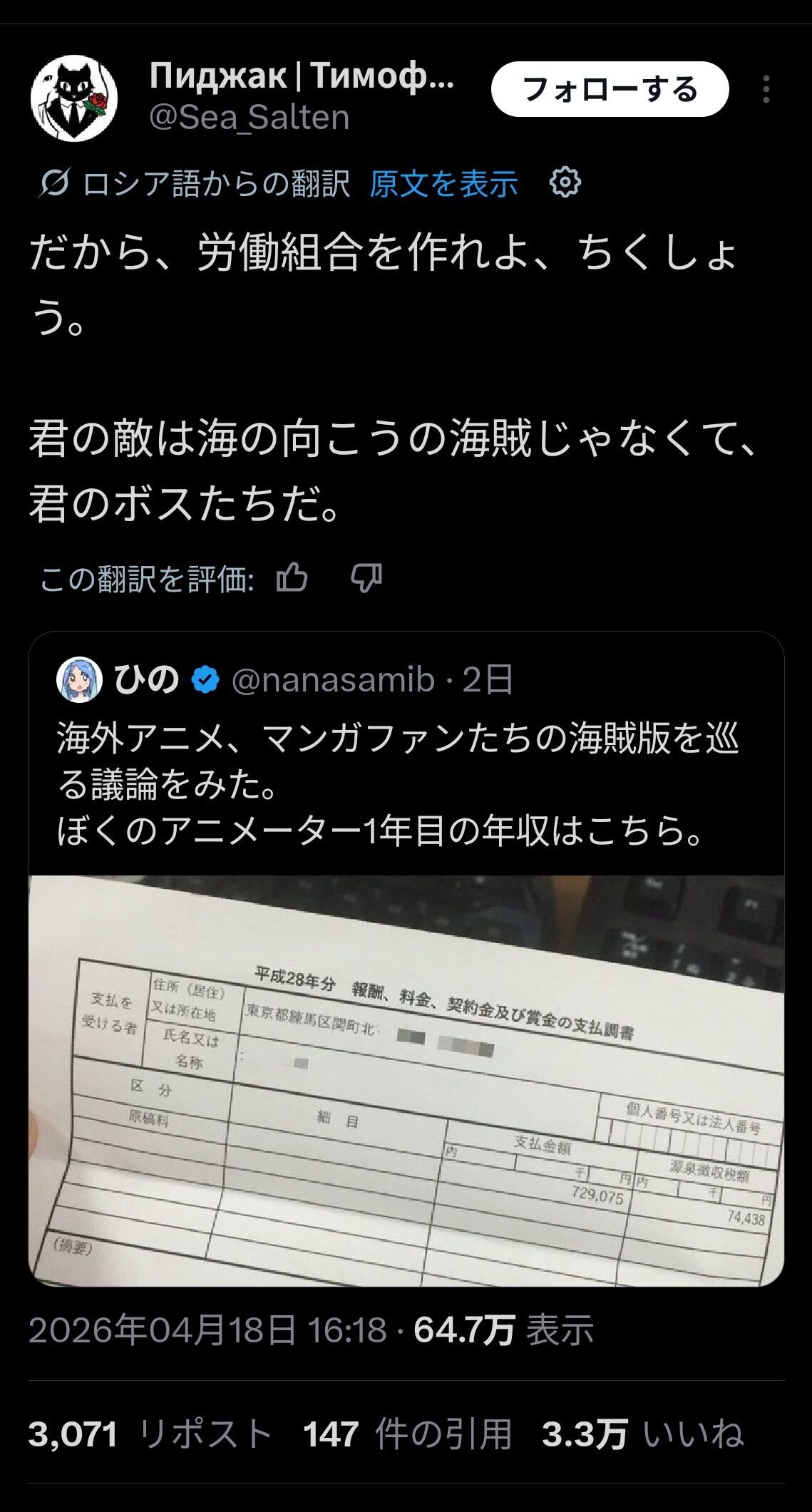 【画像あり】アニメーター「海賊版は必要悪とか言ってる外国人、ワイらの給料見ても言えるのかよ」ロシア人「…」