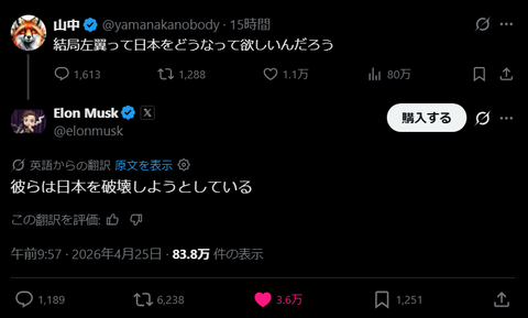 日本人「結局左翼って日本をどうしたいんだろう」イーロンマスク「左翼は日本を破壊しようとしている」
