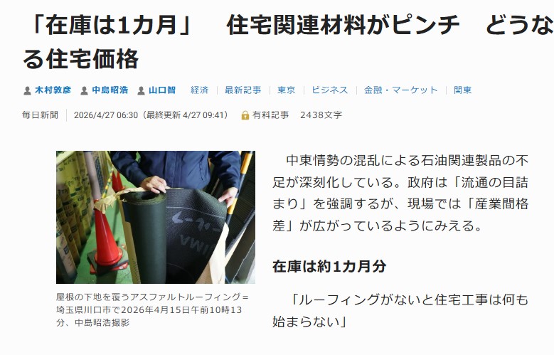 住宅関連材料がピンチ リフォームを手がけるテイガクの社長「アスファルトルーフィングの在庫1か月・・・」 どうなる住宅価格