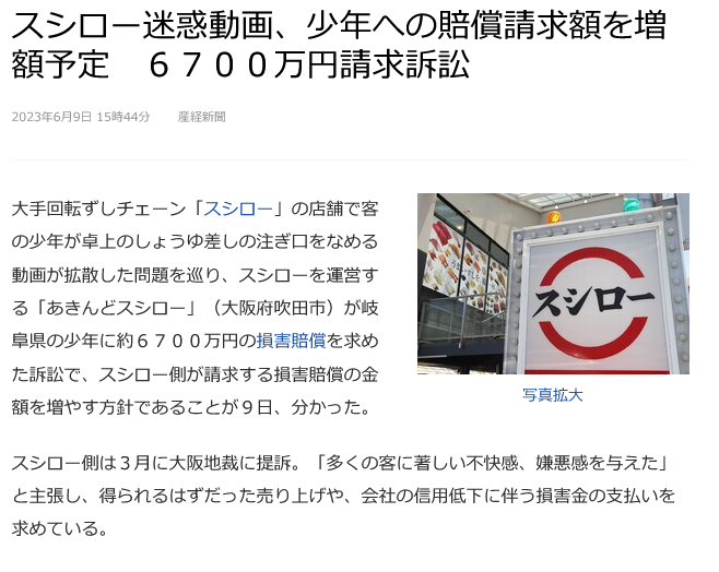 スシロー、しょうゆ差し舐める迷惑動画の少年への賠償請求額を9300万円に増額へ