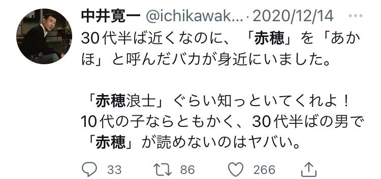 中井寛一@ichikawakon30代半ば近くなのに、「赤穂」を「あかほ」と呼んだバカが身近にいました。「赤穂浪士」ぐらい知っといてくれよ!10代の子ならともかく、30代半ばの男で「赤穂」が読めないのはヤバい。2020/12/14 22:17:42
