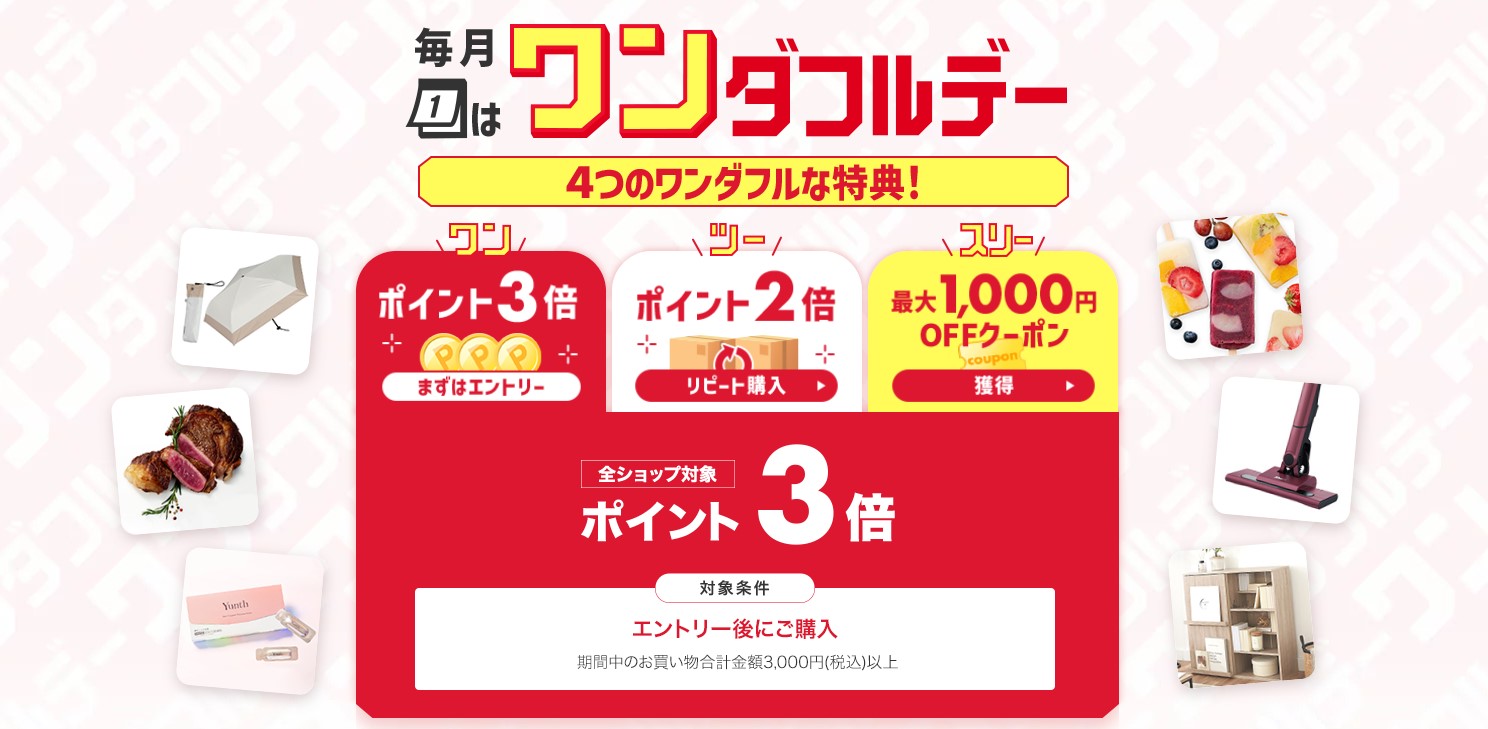 楽天市場「」全ショップポイント3倍 ワンダフルデー」「リピート購入ポイント2倍」「野球勝利2倍」を開始