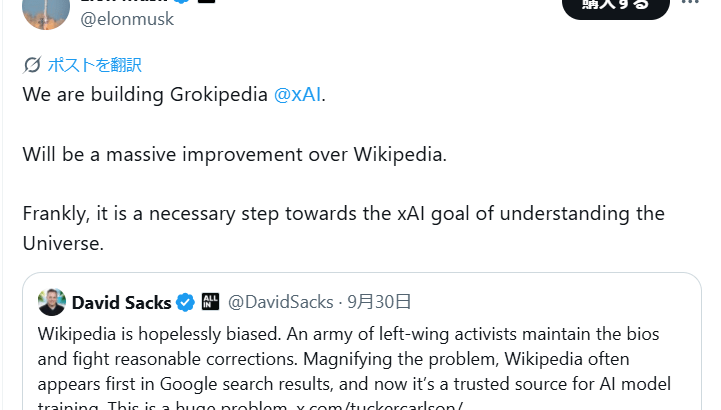【xAI】Wikipediaに代わる「Grokipedia」マスク氏企業が開発中 「Wikipediaは左翼的」という声に返信 1: 山師さん 2025/10/01(水) 14:05:04.50 ID:J3sh6Ycc9 ITmedia NEWS Wikipediaに代わる「Grokipedia」マスク氏企業が開発中 「Wikipediaは左翼的」という声に返信 … なんJ・VIP 【悲報】夜勤、 […]