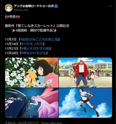 金曜ロードショー、細田守監督作品を4週連続放送「おおかみこどもの雨と雪」「バケモノの子」「竜とそばかすの姫」「時をかける少女」 1: 名無し 2025/10/17(金) 06:44:40.15 ID:MZ2PWgp69 アンク@金曜ロードショー公式@kinro_ntv🎊発表🎊最新作『果てしなきスカーレット』公開記念 ✨4週連続・細田守監督作品✨ 11月7日 『#おおかみこどもの雨と雪』11月14 […]