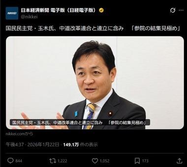 日経新聞「国民民主党・玉木氏、中道改革連合と連立に含み」 1: 名無し 26/01/22(木) 16:40:32 ID:IEeE 日本経済新聞 電子版(日経電子版)@nikkei国民民主党・玉木氏、中道改革連合と連立に含み 「参院の結集見極め」https://www.nikkei.com/article/DGXZQOUA21BO70R20C26A1000000/https://x.com/nikk […]