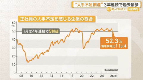 【悲報】日本、遂に正社員すらも人手不足となる。特に建設業はガチで不人気へ 1:それでも動く名無し 2026/02/24(火) 23:02:13.28 ID:AHVaPfPn0 https://news.yahoo.co.jp/articles/5fc4cc6f67218238d345b0884b3f7c36ac796dd7 >帝国データバンクによりますと、正社員の不足を感じている企業は52.3%と […]