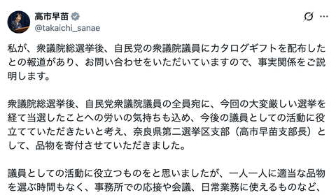 【高市総理 】“カタログギフト配布”を認める 自身のXを更新 衆議院選挙で当選の自民党議員に数万円相当のカタログギフト配布 1: 稼げる名無しさん :2026/02/24(火) 22:42:18.10 ID:wARKStP+9 高市総理側が2月におこなわれた衆議院選挙で当選した自民党議員に対し、当選祝い名目で数万円相当のカタログギフトを配布していたことが分かりました。高市総理も自身のXを更新し、認 […]